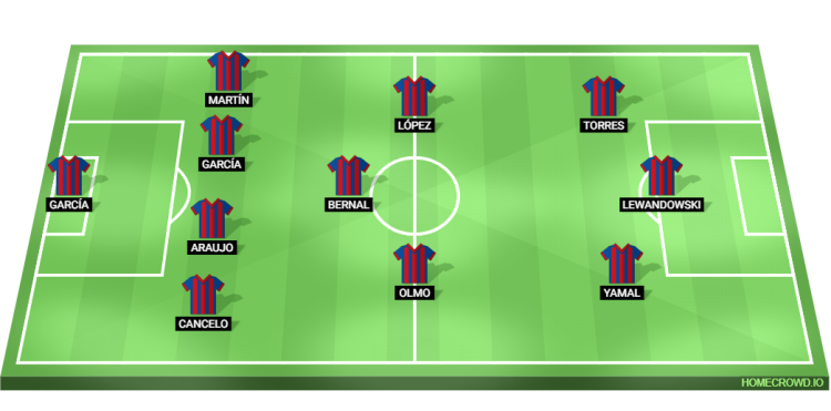 Predicted Barcelona XI: Joan Garcia; Cancelo, Araujo, Eric Garcia, Martin; Olmo, Bernal, Lopez; Yamal, Lewandowski, Torres