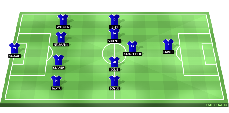 Probable Lineup (4-5-1): Allsop; Iwata, Klarer, Neumann, Wagner; Doyle, Solis, Vicente, Stansfield, Gray; Priske