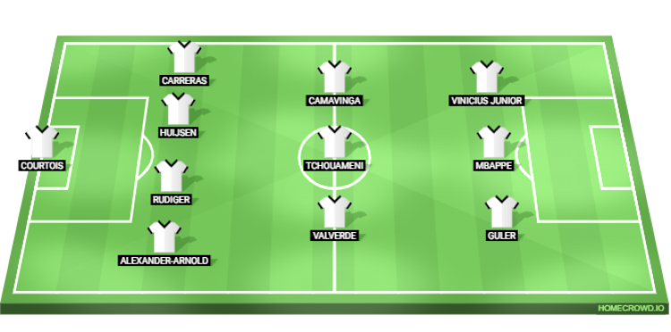 Predicted Real Madrid XI: Courtois; Alexander-Arnold, Rudiger, Huijsen, Carreras; Valverde, Tchouameni, Camavinga; Guler, Mbappe, Vinicius Junior