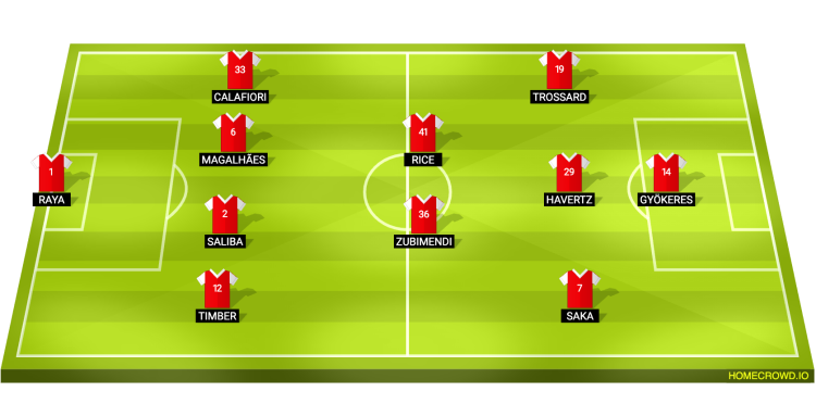 Predicted Arsenal XI: Raya; Timber, Saliba, Gabriel, Calafiori; Zubimendi, Rice; Saka, Havertz, Trossard; Gyokeres