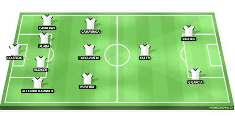 Predicted Real Madrid XI: Courtois; Alexander-Arnold, Rudiger, Alaba, Carreras; Valverde, Tchouameni, Camavinga; Guler; Gonzalo Garcia, Vinicius Junior