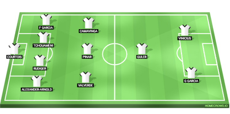 Predicted Liverpool XI: Courtois; Alexander-Arnold, Rudiger, Tchouameni, Fran Garcia; Valverde, Pinar, Camavinga; Guler; Gonzalo Garcia, Vinicius Junior