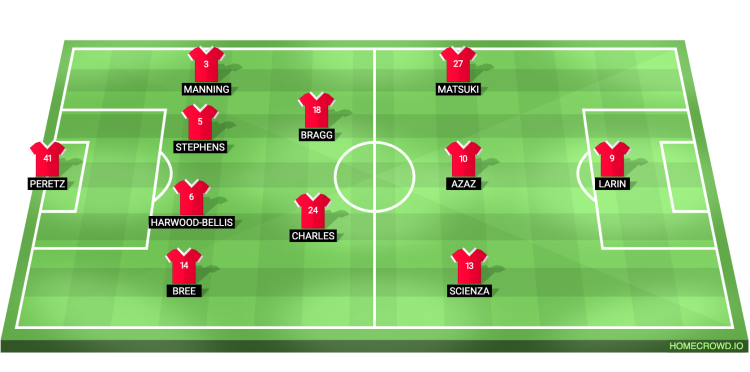 Probable Lineup (4-2-3-1): Peretz; Bree, Harwood-Bellis, Stephens, Manning; Charles, Bragg; Matsuki, Azaz, Scienza; Larin
