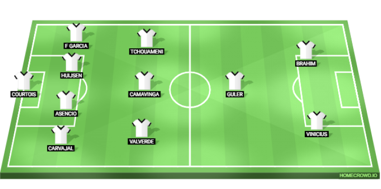 Predicted Real Madrid XI: Courtois; Carvajal, Asencio, Huijsen, Fran Garcia; Valverde, Camavinga, Tchouameni; Guler; Vinicius Junior, Brahim