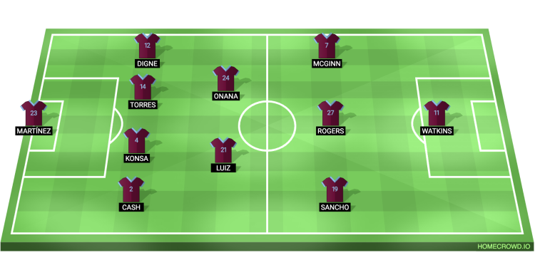 Probable Lineup (4-2-3-1): Martinez; Cash, Konsa, Torres, Digne; Onana, Luiz; McGinn, Rogers, Sancho; Watkins
