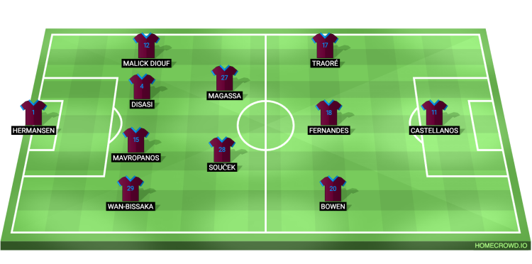 Probable Lineup (4-2-3-1): Hermansen; Wan-Bissaka, Mavropanos, Disasi, Diouf; Soucek, Magassa; Bowen, Fernandes, Traore; Castellanos