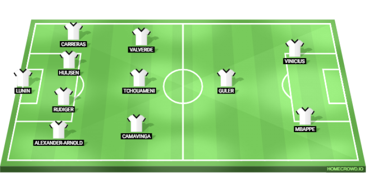 Predicted Real Madrid XI: Lunin; Alexander-Arnold, Rudiger, Huijsen, Carreras; Camavinga, Tchouameni, Valverde; Guler; Mbappe, Vinicius Junior