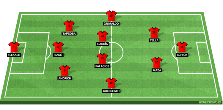 Probable Lineup (3-4-2-1): Flekken; Andrich, Bade, Tapsoba; Culbreath, Palacios, Garcia, Grimaldo; Maza, Tella; Schick