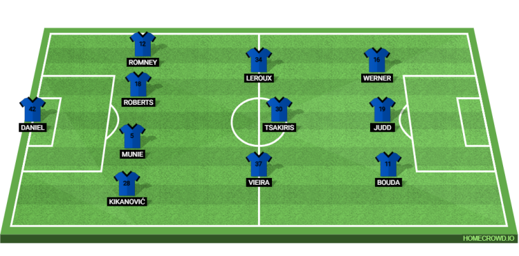 In midfield, the trio of Ronaldo Vieira, Niko Tsakiris, and Beau Leroux is expected to provide a blend of creativity, energy, and control. Vieira will sit slightly deeper to shield the defence, while Tsakiris operates as the primary playmaker and Leroux adds forward thrust with late runs into the box. The front three should feature Ousseni Bouda on the right wing, Preston Judd through the centre as the main striker, and Timo Werner on the left, using his pace to stretch defences and create space in attacking areas.