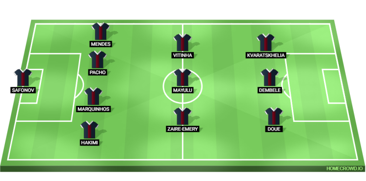 Probable Lineup (4-3-3): Safonov; Hakimi, Marquinhos, Pacho, Mendes; Zaire-Emery, Mayulu, Vitinha; Doue, Dembele, Kvaratskhelia