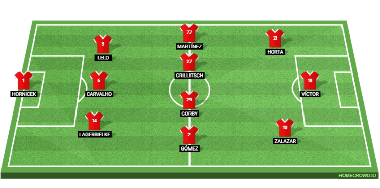 In midfield, Victor Gomez is set to play as the right wing-back, while Gorby and Florian Grillitsch, if fit, are expected to operate centrally, with Gabri Martinez featuring as the left wing-back. In attack, Rodrigo Zalazar is likely to start on the right side of the front three, Pau Victor should lead the line as the central striker, and Ricardo Horta is expected to operate from the left flank, providing both creativity and goalscoring threat.